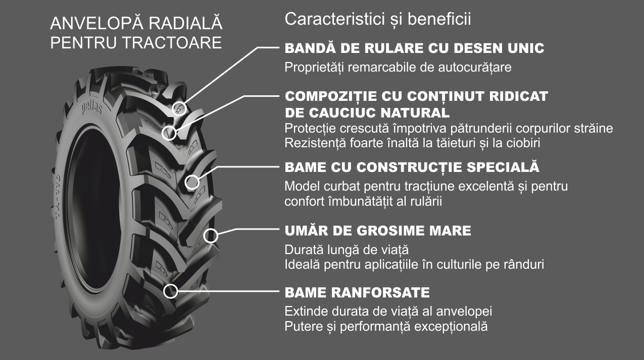 Anvelopa radiala de tractiune pentru aplicatii agricole de inalta performanta si durata de viata lunga.